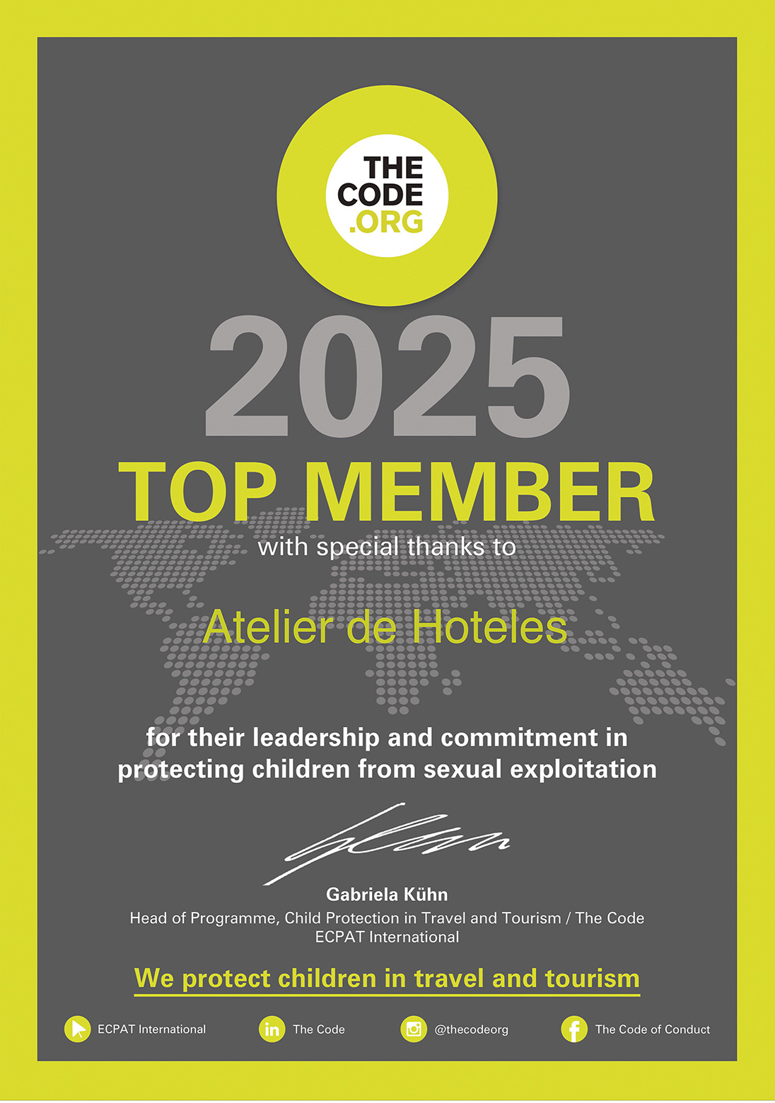 At ATELIER de Hoteles we take care of and protect children against any kind of sexual or commercial exploitation, which is why we have adopted “THE CODE” Code of Conduct to fundamentally complement our social responsibility and values; we also disapprove of any activity that affects or hurts the integrity of any person, especially children anywhere in the world.